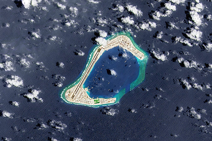 A satellite image of Subi Reef, an artificial island that Beijing is developing in the Spratly Islands in the South China Sea, in September. Credit United States Geological Survey, via Getty Images