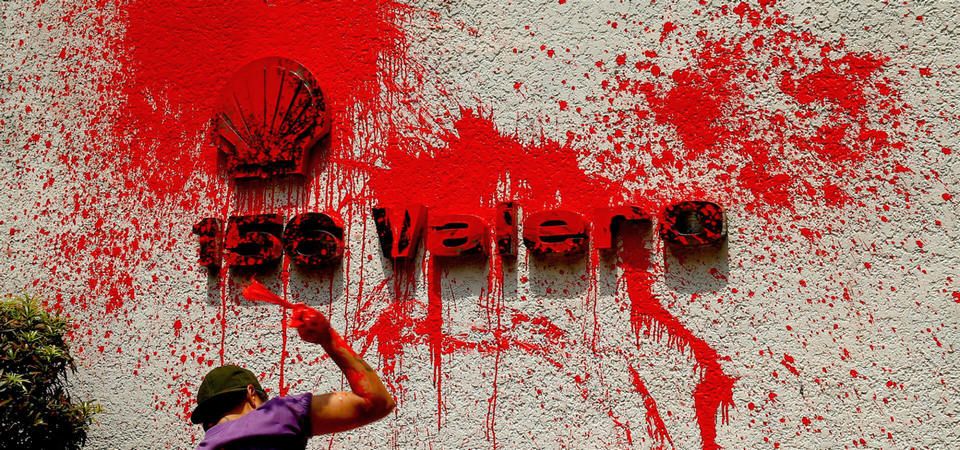 A protester splashes red paint at the logo of Shell, one of the three big oil companies in the Philippines, to denounce an increase for the eighth consecutive week, Oct. 5, 2018 in Makati, Philippines. Bullit Marquez | AP