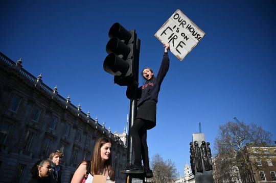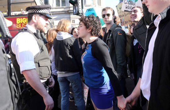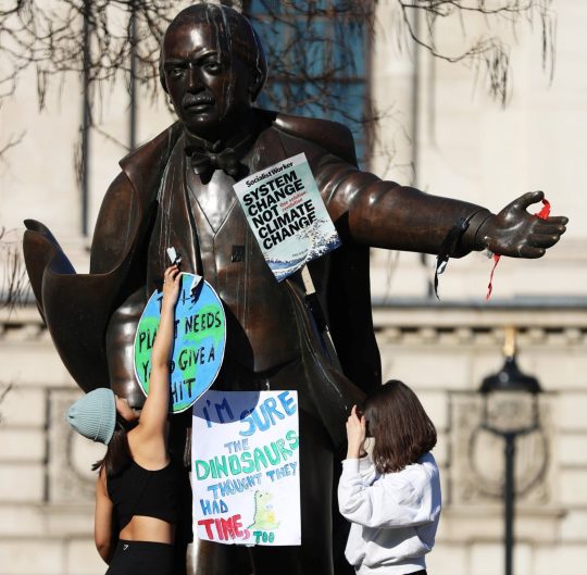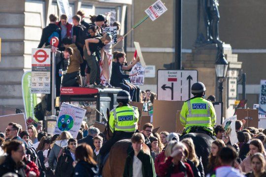 (Picture: PA) However, a student could be heard speaking over a loudspeaker saying that ‘violence’ was unnecessary, pleading with the crowd to keep the protest peaceful. The girl told the crowd: ‘If we’re angry and promote violence, that’s not going to help us. We need positivity.’ The protest spilled out of Parliament Square and up Parliament Street and to Downing Street. Others climbed into the window arches of buildings on the corner of Parliament Street and Great George Street singing ‘save our planet’. Children could be seen picking up rubbish following the marches.