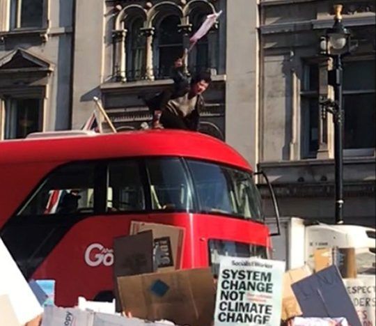 Officers also continued to form a human wall around the north-eastern square trying to keep the Some young protesters could be seen climbing on top of traffic lights around Parliament Square waving banners and placard. Some scaled the statues in the square, including the one of Sir Winston Churchill, while placards were hung from the statue of David Lloyd George, with one reading: ‘You can have capitalism or you can have the planet.’ Others ripped up homemade signs, chanting ‘f*** Theresa May’. One man climbed on top of a double-decker bus