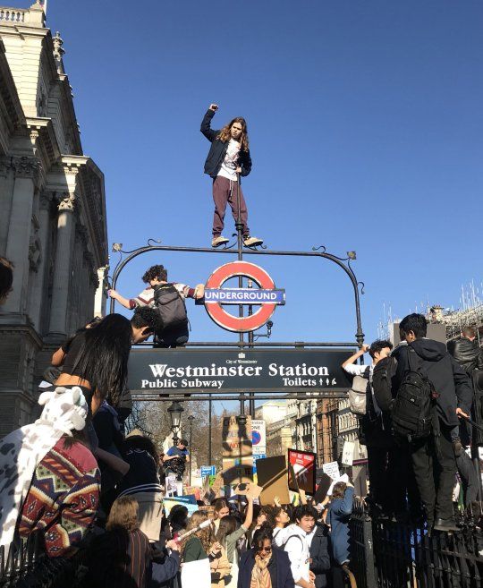 (Picture: EPA) A student from the Youth Strike 4 Climate movement climbs onto an undergound sign (Picture: PA)
