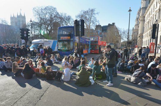 (Picture: Getty Images) Some young protesters climbed to the top of traffic lights around Parliament Square bearing banners and placards (Picture: PA) Police have begun moving some of the protesters sitting in the road, but many groups remain