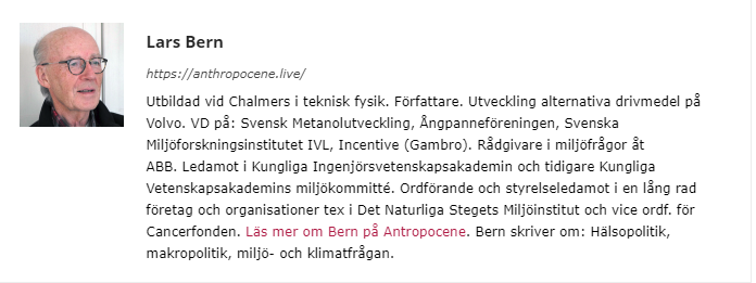 Lars Bern has worked with environmental issues for 35 years. He is the founder of The Natural Step and was formerly CEO of Ångpanneföreningen and IVL Svenska Miljöinstitutet and member of the King. The Science Committee's Environmental Committee.