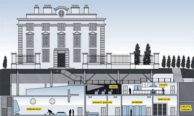 Such fantasies are not restricted to this one man alone. The past five years have seen sprawling underground leisure lairs excavated across west London, from Knightsbridge to Belgravia, Fulham to Notting Hill. They contain playrooms and cinemas, bowling alleys and spas, wine cellars and gun rooms – and even a two-storey climbing wall. It is leading to a kind of iceberg architecture, a humble mansion on the surface just the visible peak of a gargantuan underworld, with subterranean possibilities only limited by the client's imagination.