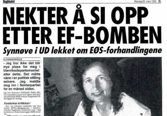 Da hun i 1992 gikk offentlig ut mot den såkalte EØS-avtalen, ble hun erklært alvorlig sinnslidende og avskjediget av regjeringen Gro Harlem Brundtland. Synnøve har fortalt om sine opplevelser i diplomatiet og psykiatrien i Skjoldmøysagaen og Nornens Beretning som er gratis tilgjengelig på nettet. Eøs- direktiver innført stikk i strid med Grunnloven og Stortinget. Bjarne Lindstrøm i UD var en primus motor i å få innført EØS – direktivene i dølgsmål (hemmelighet) Dette er i følge Straffelovens § 83 rettsstridig. Norsk rett bygger nemlig på det såkalte allmenningsprinsippet. Etter dette prinsipp har alle mennesker i utgangspunktet den samme rett og plikt til å delta i forvaltning og utnyttelse av naturressursene, uavhengig av etnisk opprinnelse, kjønn eller nummer i søskenrekken.