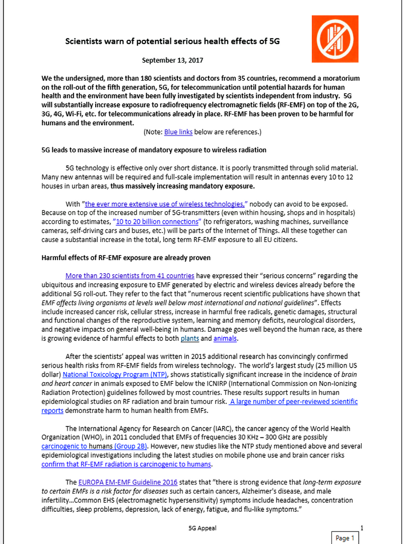 "Vi, de undertegnede, mer enn 180 forskere og leger fra 35 nasjoner, anbefaler et moratorium på rull-ut av femte generasjon, 5G, for telekommunikasjon til potensielle farer for menneskers helse og miljøet er blitt fullt ut undersøkt av uavhengige forskere fra industrien."