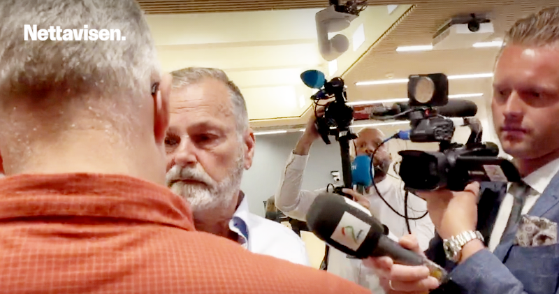 Jensens samboer, Ragna Lise Vikre, sitter på tilhørerplassen, tilsynelatende fattet. Hun har på seg solbriller og ser mot Jensen.