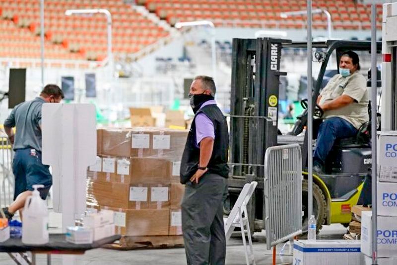 Some of the 2.1 million ballots cast during the 2020 election, are brought in for recounting at a 2020 election ballot audit ordered by the Republican lead Arizona Senate at the Arizona Veterans Memorial Coliseum, during a news