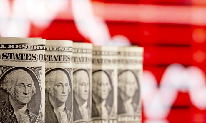 U.S. one dollar banknotes are seen in front of displayed stock graph in this illustration taken on Feb. 8, 2021. (Dado Ruvic/Reuters)