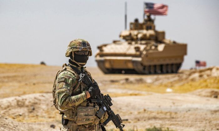 A U.S. soldier stands near a Bradley Fighting Vehicle (BFV) during a patrol near the Rumaylan (Rmeilan) oil wells in Syria's northeastern Hasakeh province on June 22, 2021. (Delil Soulieman/AFP via Getty Images)