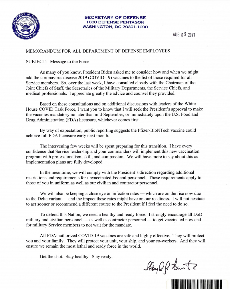 Simply, COVID-19 forced-inoculation could prove to be a grave national security threat at a time when the nation can least afford it. We must immediately pause and reevaluate the U.S. defensive strategic assessment of COVID-19 vaccinations for the entire Department.