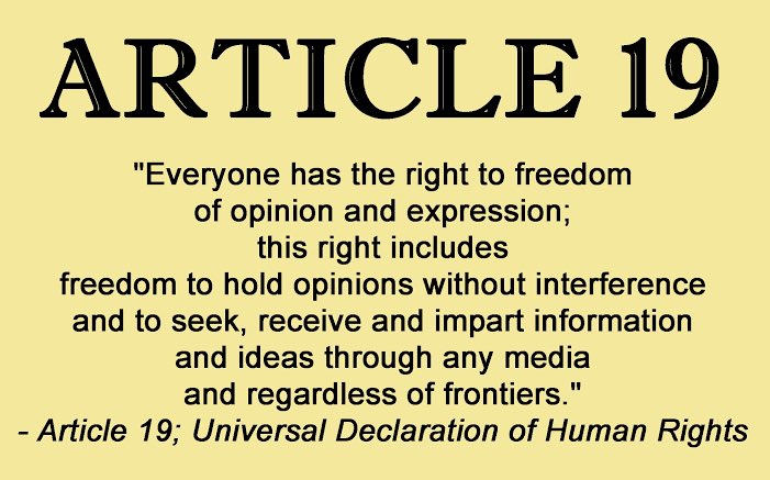 Everyone has the right to freedom of opinion and expression; this right includes freedom to hold opinions without interference and to seek, receive and impart information and ideas through any media and regardless of frontiers.