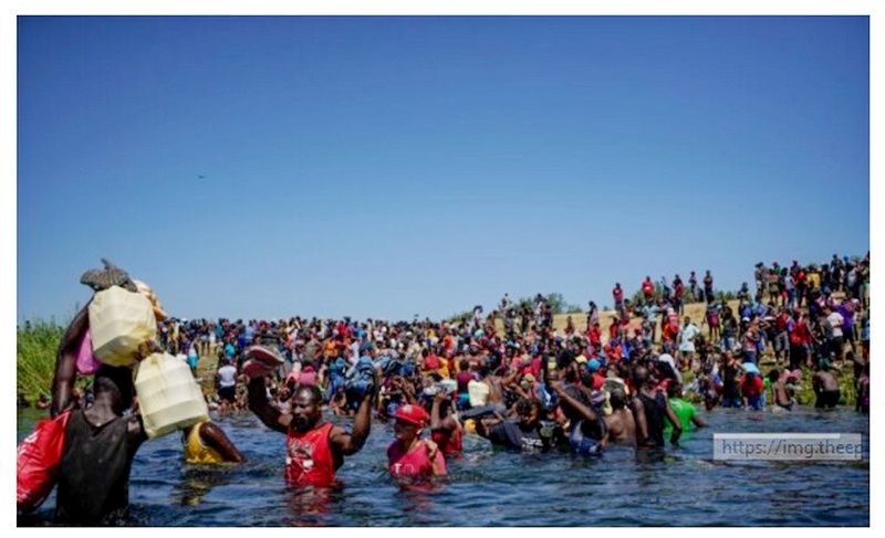 Haitian migrants, part of a group of over 10,000 people staying in an encampment on the U.S. side of the border, cross the Rio Grande river to get food and water in Mexico, after another crossing point was closed near the Acuna Del Rio International Bridge in Del Rio, Texas, on Sept. 19, 2021. (Paul Ratje/AFP via Getty Images)