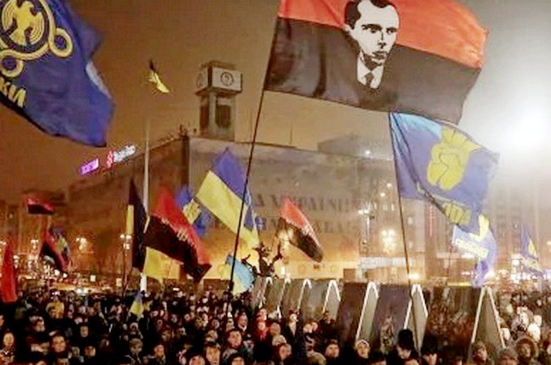 Featured image: 2015 march in Kyiv to celebrate the birthday of Nazi collaborator Stepan Bandera (pictured on black and red flag) (Source: Liberation News)