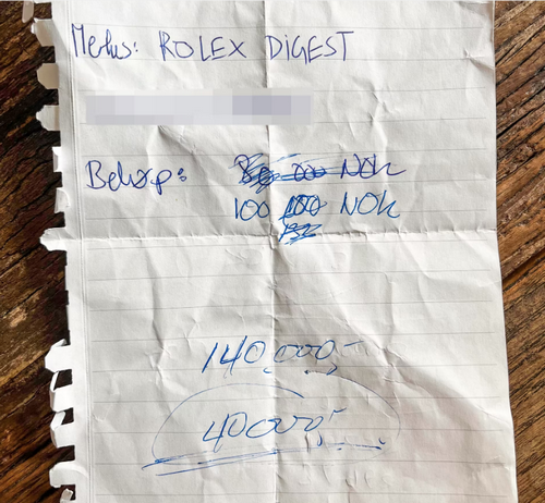 The woman paid a sum of 100,000 kroner to the account number on the note, the woman's bank statements show.
