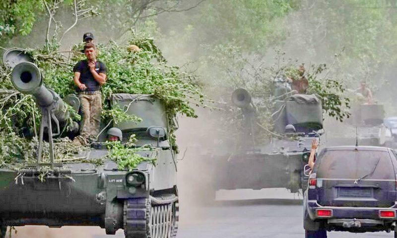 Ukrainian servicemen ride American 155 mm turreted self-propelled howitzers M109 in Donetsk region, Ukraine, on June 13, 2022. (Gleb Garanich/Reuters)