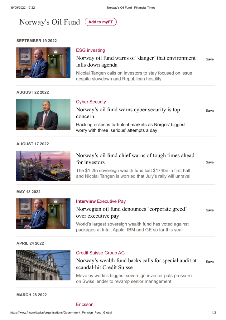 Nicolai Tangen, head of Norway’s $1.2tn oil fund, told the Financial Times that “we are observing the backlash against ESG in some places in America. Despite times being volatile in financial markets and increase in the economy, we think it’s more important than ever to retain the focus on these extremely important matters.”