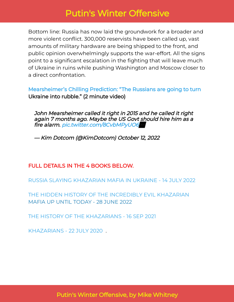 Oct 21, 2022 1 min read PUTINS WINTER OFFENSIVE MEARSHEIMER S CHILLING PREDICTION - VIDEORUSSIA SLAYING KHAZARIAN MAFIA - BOOKTHE HIDDEN HISTORY OF THE EVIL KHAZARIANS -BOOKTHE HISTORY OF THE KHAZARIANS - BOOKKHAZARIANS - BOOK
