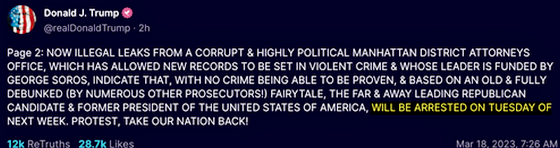 Susan Necheles, a lawyer for Trump, said his remark about the timing of his arrest was gleaned from media reports on Friday about local and federal law enforcement players expecting to convene early next week to discuss security and logistics related to Trump’s expected indictment.