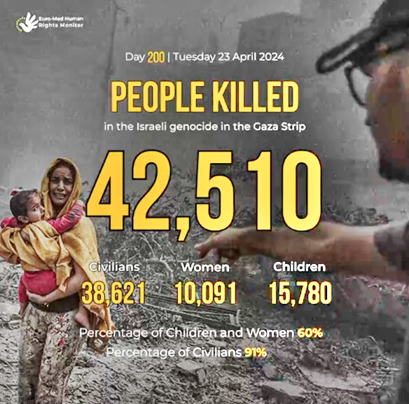 For no one has the right to kill an innocent human being, let alone tens of thousands of them, without let. (June 8: 210 Palestinians have been murdered and more than 400 wounded in Israel’s latest massacre, this time at the Nuseirat refugee camp, in central Gaza.)