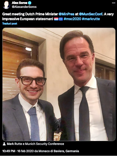 Atlantic Alliance leadership is going from a Bill Gates puppet like Jens Stoltenberg (former director of the Vaccine NGO GAVI Alliance) to the resigning Dutch Prime Minister Mark Rutte, one of George Soros’ circle, who had himself photographed several times with his son Alex, heir to the empire of the Open Society Foundation’ Zionist tycoon, since the 2020 Munich Conference.