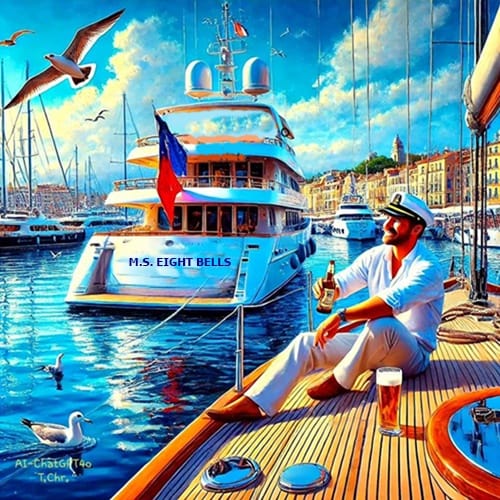 This painting of the m.s. Eight Bells captures more than just a scene of leisure at a Cannes harbor; it evokes the timeless human pursuit of freedom, connection, and presence.
