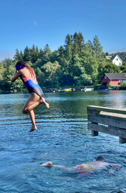 The day ended with a swim in the crystal-clear sea, the cool water a refreshing contrast to the summer heat. Tone floated on her back, her laughter echoing across the waves, while Per dove beneath the surface, reemerging with a handful of smooth, colorful pebbles he presented to her like treasures.