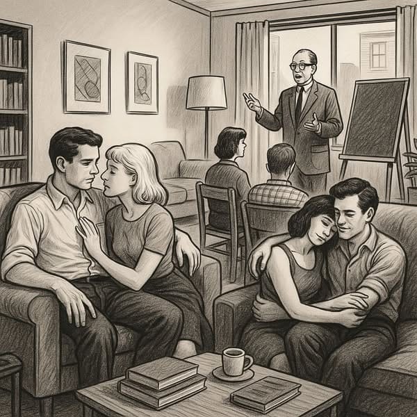There were parties almost every week: wine flowing, loud conversations about politics, psychoanalysis, and art. Casual sex was considered healthy and encouraged — but also monitored, since therapists believed your choices revealed deep-seated issues. The goal was "freedom," but in reality, people were under constant emotional surveillance.