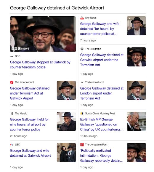Paradoxically, the only outlet that has offered a follow-up – as shown in the screenshot above of a Google search late this afternoon – was from the rightwing Israeli outlet The Jerusalem Post. Uniquely, its headline “‘Politically motivated intimidation’: George Galloway reportedly detained at Gatwick airport” captures the story the British media is carefully avoiding.